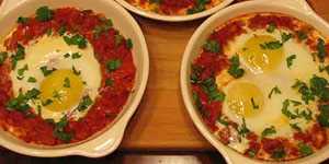 Ее вы можете приготовить заранее, а в нужное время просто разогреть и дальше весь процесс приготовления шакшуки займет не более 20 минут, что очень удобно. Далее матбуха раскладывается по порционным сковородкам в которых блюдо в итоге и подается к столу. В помидорной массе делаются углубления. В углубления вбиваются яйца, подсаливаются.
