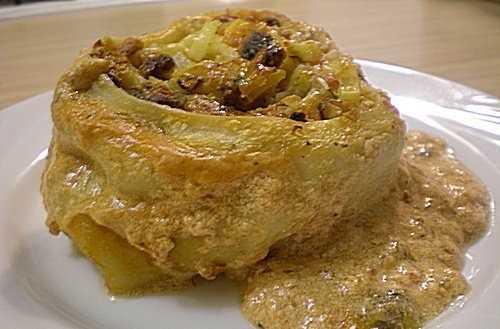 Достаньте из холодильника тесто и раскатайте большой круг толщиной примерно 2-3 мм. Выложите на него ровным слоем начинку и заверните на нее края теста, а затем аккуратно заверните тесто с начинкой в рулет и защипните края. Теперь рулет нарежьте на кольца толщиной 4-5см.