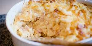 В миску отправляем макароны. Туда же - бекон с луком. И соус. Хорошо перемешиваем.