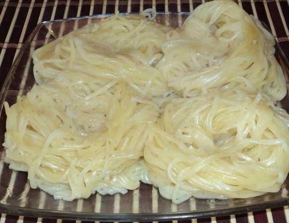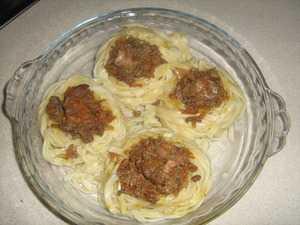 Третий вариант. В неглубокую посуду поместите «гнезда», налейте немного воды, посолите, накройте крышкой и на небольшом огне доведите их до готовности. Затем выложите их в смазанную маслом форму для запекания, разложите начинку (можно посыпать зеленью и тертым сыром) и поставьте на 10 минут в духовку, разогретую до 180 градусов.
