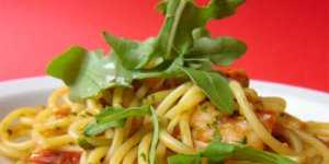 Слить спагетти, смешать с соусом и грубо нарезанной рукколой, оставив несколько листьев рукколы для украшения блюда.
