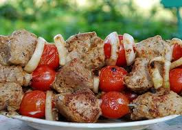 Мясо нарезать на небольшие кусочки, отбить (средне) через пленку. Готовим соус: ткемали, сацебели, пасту карри, молотый карри, смесь перцев, аджику, гвоздику, соль - все смешать и обмазать силиконовым кисточкой все кусочки (если кисточки нет, то просто обвалять все в соусе). В большой котел класть чередуя: мясо и лук. Когда все закончится, залить водой и яблочным уксусом, сверху положить лавровый лист. И под груз на ночь. На следующий день достаем и жарим на мангале. Когда жарим, то кусочки для сочности не только поливаем маринадом, но и обмазываем тем же соусом, но без гвоздики. Как только обжарятся, сразу подавать, потому что будет так пахнуть, что все съедите на отходя от мангала)). При подаче посыпать зеленью. Приятного аппетита!