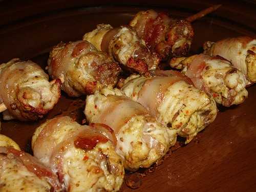 Выкладываем в маринад куриное филе, ставим на 1 час в холодильник. За это время нужно будет пару раз перемешвать куриное филе, чтобы оно промариновалось равномерно. Через час куриное филе готово к обжаривания. Нанизываем на каждую деревянную шпажку по две полоски мяса в виде гармошки.