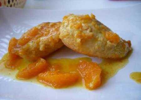 4. В другую сковороду вылить сок от трех апельсинов, добавить цедру и мед (сахар), уварить в два раза. Добавить апельсиновые дольки и тушить пару минут.