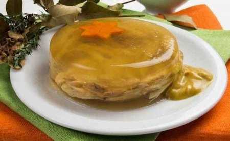 Перед подачей на стол, подержать форму в кипятке, перевернуть. Подавать с хреном и горчицей к праздничному столу.