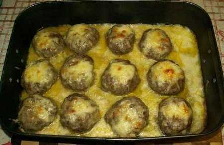 Приготовить фарш. Сформировать котлетки и сделать небольшое углубление. Засыпать в углубление сыр. Залить соусом. (Смешать муку с холодным молоком, растопить масло, залить молоко с мукой и прогреть). Запекать в духовке 20-25 минут при 200 градусов.