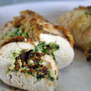 Разогреть духовку до 175 градусов и слегка смазать лист выпечки. Нарезать все овощи. Смешать шпинат, чеснок, базилик и сыр в небольшой миске. Потолочь вилкой пока сыр хорошо не распределится, добавить помидоры. Если куриные грудки большие, разрежьте их на две части. Начинку распределить по грудке и завернуть рулетом с помощью пищевой пленки. Посыпать две стороны курицы солью и перцем. Закрепить зубочистками. Слегка обжарить на сковороде в масле и допечь в духовке в течение 25-30 минут. Удалить зубочистки и подавать.