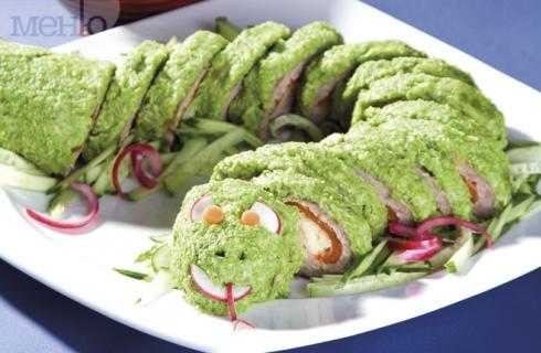 4. Мокрыми руками зеленую пасту нанести на рулет. Рот и глаз змеи сделать ломтиками редиски и моркови. Нарезать ломтиками и положить в блюдо. Нарезать огурец и разложить возле змеи.