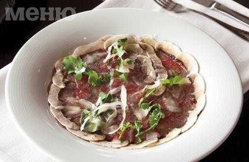 1.Вырезку говядины нарезать тонкими, почти прозрачными ломтиками и выложить на дно неглубокой посуды.
