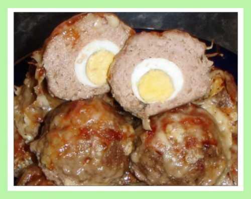 В полученный фарш закатывают сваренные вкрутую и очищенные яйца, смачивают в льезоне, панируют и жарят во фритюре.