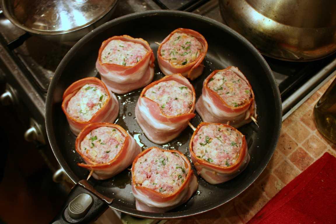 4. Из полученного фарша сформируем котлетки и каждую обернём полосочкой бекона.