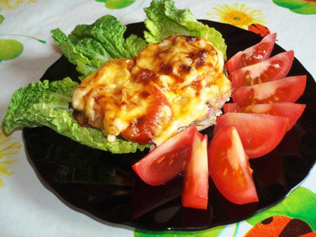 3. На смазанный растительным маслом противень выложить мясо и сверху положить лук и помидоры, полить майонезом. Запекать в духовке до готовности.