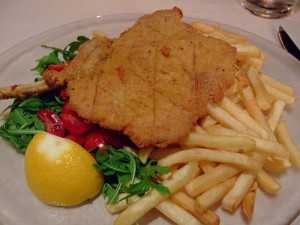 Котлеты (на косточке) сформовать, отбить, посолить и обжарить до золотистой корочки. В оставшемся жире протушить мелко нарезанные коренья, лук и яблоко, томат-пюре. На дно сотейника положить кусочки шпика, на них - половину овощной смеси, котлеты, остальную овощную смесь, посыпать мукой и тушить около часа; затем добавить вино, бульон, уксус, пряности и тушить еще 10 минут. Подать с соусом, жареным картофелем и салатом.
