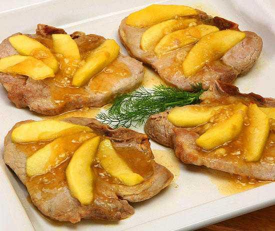 Отбивные котлеты посолить, поперчить и обжарить в растительном масле. Снять их со сковороды и обжарить на ней же нарезанные кружочками очищенные яблоки. Яблоки выложить поверх отбивных, снова переложить все на сковородку, залить медом, добавить 1/3 стакана воды. Накрыть крышкой и протушить мясо в течение 15-20 минут.