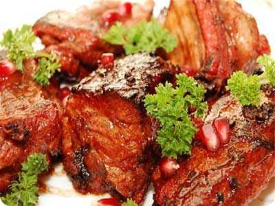 Ребрышки хорошо промыть и обсушить. Сделать небольшие надрезы с каждого ребра. Тонкие ломтики очищенного чеснока воткнуть в надрезы. Хорошо промазать гранатовым соусом и оставить в холодильнике на 2-3 часа.