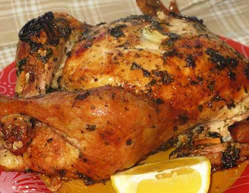 Намазываем сливочной смесью нашу курочку также и снаружи, и внутри. Вокруг раскладываем морковки, зубочки чеснока (прямо в кожуре) и веточки тимьяна. Внутрь куры тоже положите кустик тимьяна. Морковку сбрызгиваем оливковым маслом и чуть посолим. Ножки свяжем ниткой.