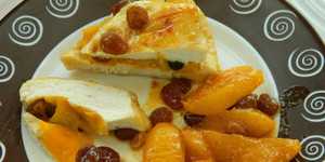 Подготовить начинку: распарить изюм – залить кипятком на 15 минут, абрикосы без косточек нарезать тонкими дольками, все залить лимонным соком и перемешать.