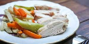 Переложить конверты с курицей и овощами в жаропрочную форму. Запекать в прогретой до 180 С духовке около 20 минут. Готовые овощи и нарезанную ломтиками куриную грудку разложить на тарелку.