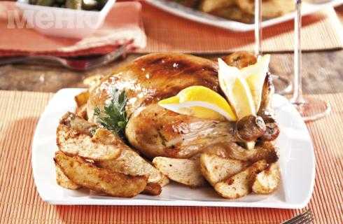 5. Курица подается с картофелем фри и сезонным салатом.