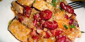 Закрыть крышкой и дать мясу приготовится, изредка помешивая. За 10 минут до готовности всыпать фасоль в томатном соку и дать потушиться 10 минут.