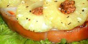 Выложить поверх ветчины колечки ананасов и смазать их оставшейся глазурью.