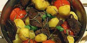 В сковороду к мясу переложить отварной картофель и помидоры, сбрызнуть оливковым маслом (1 столовая ложка), а сверху уложить веточки розмарина. Поставить в предварительно нагретый до 200 градусов духовой шкаф на 15-20 минут.