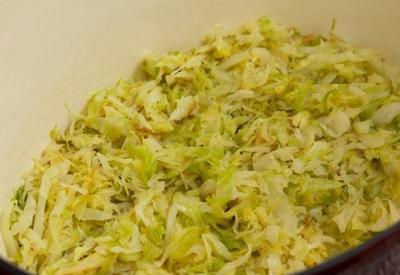 - В другую сковороду наливаем растительное масло и выкладываем измельченную капусту. Ставим емкость на средний огонь и тушим, перемешивая деревянной ложкой. Когда капуста станет слегка мягкой, отставляем сковороду с огня в сторону.
