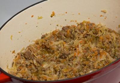 - Вторым слоем нашего блюда будет фарш. Поэтому его будем выкладывать в кастрюлю сверху тушеной капусты так, чтобы он полностью покрывал ее. Столовой ложкой разровняйте наш ингредиент равномерно по поверхности первого слоя.