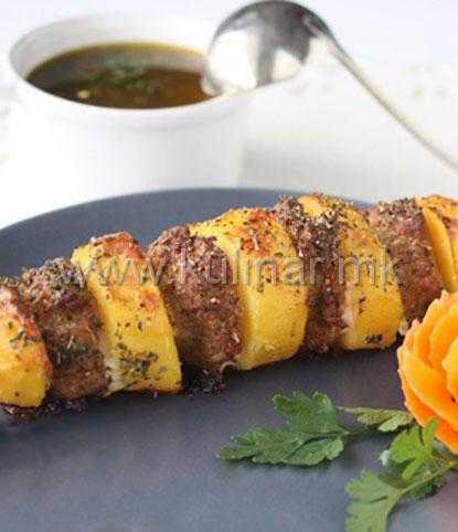 На шампур нанизать кусок картофеля и мяса, картофеля, мяса ...