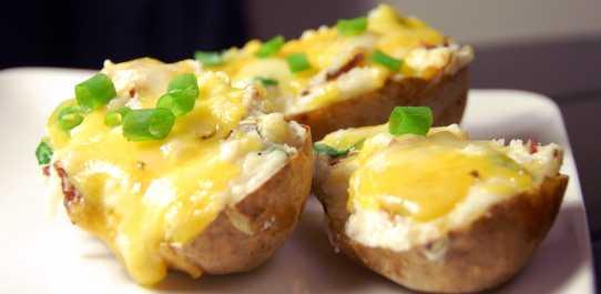 3. Дайте картофелю остыть. Разрежьте пополам. С помощью ложки сделайте в картофеле углубление, вынимая 3/4 мякоти - картофель станет похожа на каноэ.