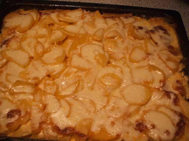 Так выложить весь картофель и залить его сливками. Разогреть до 180 ° С духовку и отправить форму на 35-45 минут. Твердый сыр натереть на мелкой терке.