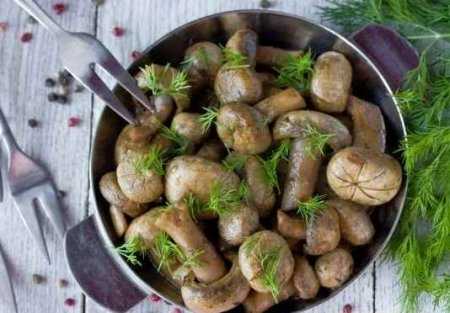 Накрываем емкость с грибочками пищевой пленкой и ставим в холодильник минимум на 6 часов. Через 6 часов получаем грибы из холодильника. Они приобрели приятный коричево-золотистый оттенок и полностью готовы к употреблению.