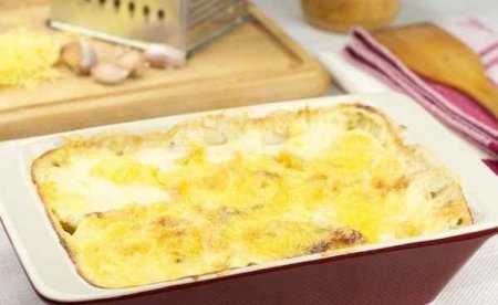 Для приготовления возьмем картофель, чеснок, сыр, специи и жидкие сливки жирностью 10%. Чеснок очистить и порезать тонкими пластинами. Сливки влить в кастрюлю, добавить порезанный чеснок, мускатный орех, черный молотый перец, посолить и довести до кипения. Снять с огня. Картофель очистить, хорошо помыть и порезать тонкими пластинами. Форму для выпечки смазать сливочным маслом. Картофель выкладывать слоями, поливая соусом из сливок. Так выложить весь картофель и залить его сливками. Разогреть до 180 ° С духовку и отправить форму на 35-45 минут. Твердый сыр натереть на мелкой терке.