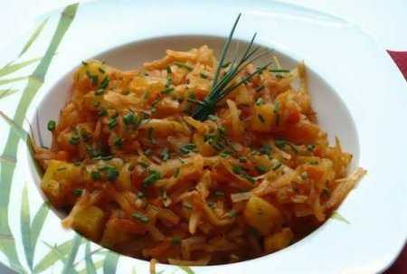 Вам понадобятся: капуста, морковь, лук, картофель, масло растительное, томатная паста, вода и соль, овощная приправа или сушеные травы, которые вы любите.