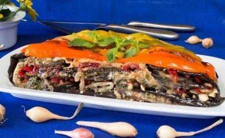 Снова выложить слой печеных баклажанов. Выложить слой тертого сыра для связывания слоев. Снова слой лука с пряностями. Последним слоем выложить помидоры. Закрыть верхнюю поверхность торта лепестками баклажанов. Сверху засыпать тертым сыром. Запекать в горячей духовке 180 ° С в течение 20 минут. Форму можно накрыть фольгой, чтобы верхний слой не зажарить.