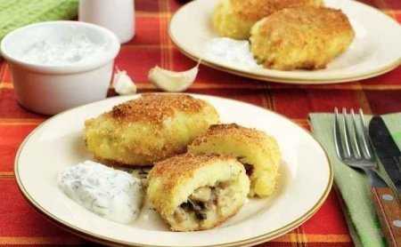 Из картофеля сформировать лепешку. В центр выложить 1-2 чайные ложки начинки. Затем картофельный корж плотно завернуть, придавая ему форму продолговатой котлеты. Так подготовить все зразы для обжаривания. Затем можно приготовить сметанный соус, соединить сметану, мелко порезанный укроп и выдавленный через пресс чеснок.
