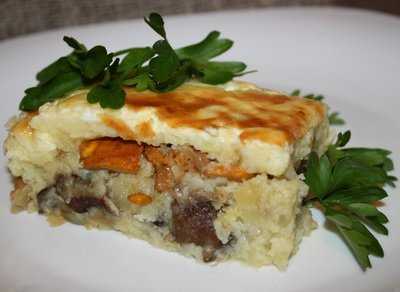 Форма, в которой запикатимемо, смазываем маслом и сверху посыпаем сухарями. Половину приготовленного пюре смешиваем с обжаренными белыми грибами и выкладываем в форму. Сверху выложим обжаренные лисички.