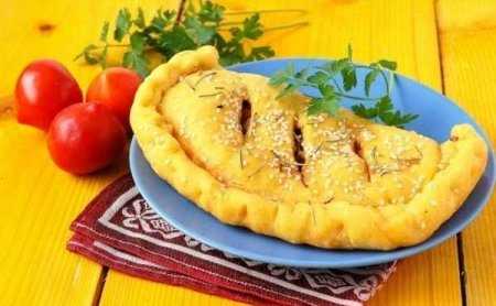 Тесто разделить пополам. Раскатать каждую часть в круг толщиной 0,7 см.Викласты начинку с одной стороны. На начинку выложить натертый сыр. Завернуть свободный конец теста на начинку. Сформировать пиццу в виде полумесяца. Смазать сверху подсолнечным маслом. По желанию посыпать кунжутом и пряными травами. Сделать 3 продольных разреза сверху. Выпекать кальцоне 20 минут при 180 ° С.