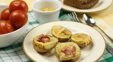 Также бекон порезать на брусочки. Твердый сыр потереть на крупной терке. Вырезать середину в половинок картофеля и смазать дно горчицей. Затем положить на дно по щепотке тертого сыра. На сыр выложить сало или бекон. Смазать противень маслом и выложить на него «кораблики». Запекать в разогретой до 180 * С духовке 45-50 минут.