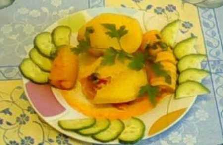 Вырезаем серединку из картофеля и начиняем фаршем. Укладываем в кастрюльку. Обжаривают морковь, лук, болгарский перец в растительном масле, добавляем в конце томатную пасту. Готовую зажарку выкладываем на наш картофель, добавляем воды, соль, перец, специи по вкусу. И тушим мин 45. Добавляем зелень.