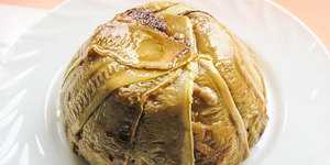 Подвернуть листочки и уложить веером. Небольшую часть омлетной смеси оставить для смазывания поверхности. Поставить в духовку на 20 минут. Остудить.