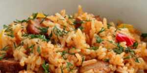 Соединить йогурт, кетчуп и пряные специи "масала бирьяни" (или собрать по своему вкусу смесь из молотых имбиря, перца чили, душистых перцев, корицы, кардамона, зиры, шафрана, бадьяна и других пряностей). Перемешать и влить эту массу на сковороду к овощам и колбаскам. На этой стадии блюдо перекликается с индийским пловом бирьяни.