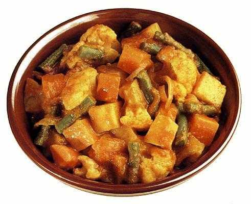 Лук и чеснок мелко порубить и немного обжарить в жиру на сковородке или толстой кастрюле, добавить карри и тушить в течении 3 мин. на слабом огне, затем добавить помидоры или томатную пасту и очищенные, измельченные стручки зеленой фасоли, можно добавить небольшое количество воды. Соус должен быть густоватым.