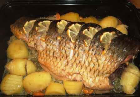 Рыбу вымыть, выпотрошить, удалить чешую. Сделать небольшие надрезы под углом 45 градусов. Рыбу посолить и поперчить, полить лимонным соком. Можно приправить специями для рыбы. Лук и морковь порезать и обжарить на сковороде. В форму для запекания сначала выложить слой овощей, посолить их. Сверху на овощи выложить рыбку. Вставить в надрезы на рыбе ломтики лимона. Запекать в духовке при температуре 180 * С 40 -50 минут. При подаче украсить на свой ??вкус. Можно немного отварить картофель и заключить вместе с карпом на противень. Можно добавить к овощам и перчик болгарский и грибочки.