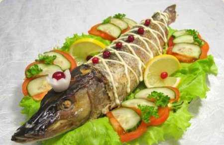 Почистить рыбу (брюшко не разрезать, плавники не вырезать, голову отделить, жабры и глаза удалить). Сделать надрезы по кругу, отделяя шкуру. Она снимается без проблем. отреза хвост. выпотрошить рыбу. Снять с костей все мясо. В молоке замочить хлеб. Перекрутить через мясорубку все составляющие, дважды. Порубить миленько зелень. Довести до вкуса, добавив соль и перец. Вбить яйцо и все снова тщательно перемешать. Заполнить шкуру рыбы фаршем не туго. На противень, застеленный фольгой, выложить рыбу, голову и смазать щедро майонезом. Завернуть фольгу и запекать при 180 * час. Только когда полностью остынет можно развернуть. Подавать холодной. Украсить.