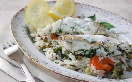 Приготовление: Рыбу нарезаем порционными кусками, сбрызгиваем лимонным соком, солим и перчим с 2 сторон. Рис промываем. Зеленый лук нарезаем. В кастрюле или сковородке, кому что удобнее, разогреваем 1 ст. л. сливочного масла. Выкладываем в нее зеленый лук и рис. Секунд 30 обжариваем. Добавляем овощи, горошек, солим перчим, заливаем бульоном. Накрываем крышкой, даем закипеть и тушим на среднем огне 10 минут. Через 10 минут выкладываем сверху рыбу, закрываем крышкой и тушим еще около 10 минут, до готовности риса и рыбы. Сверху рыбку можно смазать крем-фрешем и посыпать укропом. Вот и все. Быстро, вкусно и полезно.