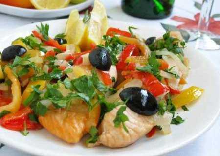 Стейки семги вымыть, обсушить, разделать на филе (разрезать стейки пополам, срезать кости и кожу). Филе семги посолить и поперчить. Болгарский перец вымыть, разрезать пополам, вынуть семена, еще раз промыть и обсушить, нарезать перец соломкой. Лук очистить, нарезать четверть кольцами. Чеснок очистить, раздавить плоской стороной ножа и мелко нарезать. Петрушку вымыть, стряхнуть лишнюю воду, отрезать длинные стебли, зелень мелко нарезать. С маслин вынуть косточки, разрезать маслины пополам. Кружки лимона разрезать на четыре части. В сотейнике (или глубокой сковороде) разогреть 2 ст. л. оливкового масла, обжарить лук, помешивая, на сильном огне 4-5 минут, добавить к луку болгарский перец, жарить еще 3-4 минуты. Затем к овощам добавить маслины, лимон, влить вино, овощи перемешать, довести до кипения и держать на огне 2 минуты (не накрывая крышкой), затем овощи посолить, поперчить, добавить чеснок, перемешать. Пока готовятся овощи, в небольшой сковороде разогреть 1-2 ст. л. оливкового масла, обжарить семгу на сильном огне по 1,5-2 минуты с каждой стороны. Перевести обжаренный семгу в сотейник (по желанию, филе семги можно "закопать" в овощах - рыба получится более ароматным), уменьшить огонь до среднего, накрыть сотейник крышкой, тушить семгу с овощами еще 5-7 минут. Готовую рыбу и овощи посыпать нарезанной зеленью петрушки, подавать блюдо горячим с долькой лимона.