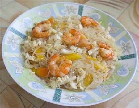 Капусту разобрать на листья, промыть и обсушить. Перец помыть и удалить сердцевины. Капусту и перец порезать тонкой соломкой. Креветки разморозить, удалить голову и кишечную вену, очистить от панцирей (вкуснее использовать свежие или охлажденные креветки). Разогреваем в сковороде оливковое масло, дольки чеснока раздавливают плоской частью ножа и обжариваем их в масле, чтобы масло приобрело чесночный аромат. Выкладываем в сковороду креветки. Обжариваем моментально с обеих сторон (1-2 минуты максимум). Готовые креветки можно перевести на салфетку, чтобы убрать лишнее масло. Готовим соус . Измельчаем чеснок и добавляем соевый соус, оливковое масло, мед, лимонный сок. Тщательно перемешиваем. Лапшу отвариваем как написано на упаковке (можно замочить лапшу в горячей воде на 5-6 минут). Откидываем на дуршлаг, промываем холодной водой. Даем воде стечь (можно слегка отжать лапшу). Крупно режем. Лапшу смешиваем с овощами и креветками. Заправляем соусом, посыпаем кунжутными семечками и подаем на стол. По вкусу добавляем соль и молотый чили. Приятного аппетита! PS Перец можно использовать любого цвета, можно и одного, а не нескольких. Соус можно регулировать по вкусу. Данное количество продуктов рассчитана на 5 порций салата.