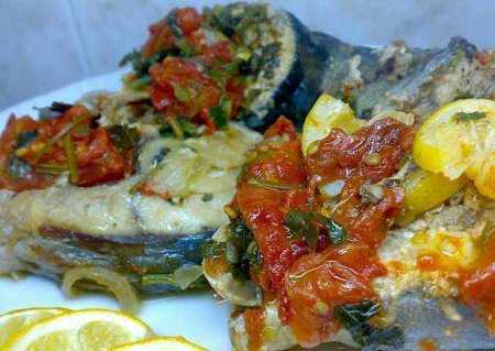 Лук нарезать полукольцами и тушить в растительном масле в широкой кастрюле. Подготовленную рыбу нарезать на куски, посолить, поперчить, уложить поверх лука в один ряд. Сверху обильно посыпать нарезанной кинзой, положить ломтики лимона, лавровый лист и добавить немного масла. Затем сверху уложить ломтики помидоров, предварительно сняв с них кожицу, посолить, накрыть крышкой и варить до готовности.
