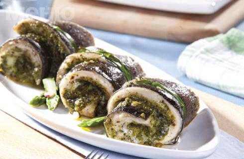 2. Филе рыбы тщательно очищают от костей. Слегка солят и посыпают перцем. Распределить на филе соус Песто (как приготовить читайте здесь), скатайте в плотный рулон, начиная с более широкого конца и свяжите перьями лука.